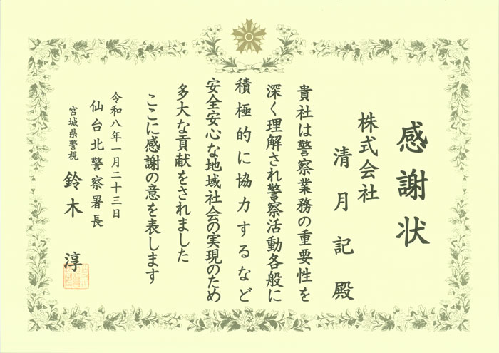 2026年1月23日、警察業務への理解と警察活動への協力が評価され、仙台北警察署より感謝状を拝受いたしました。