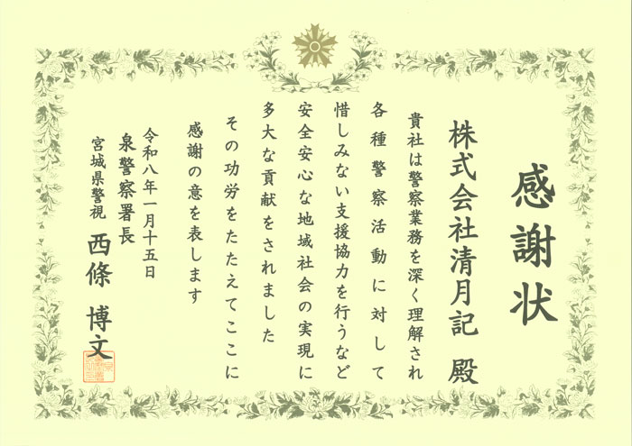 2026年1月15日、仙台泉警察署より、警察活動への支援・協力に対し感謝状を拝受いたしました。 地域の安全・安心への貢献を評価いただき、大変光栄です。