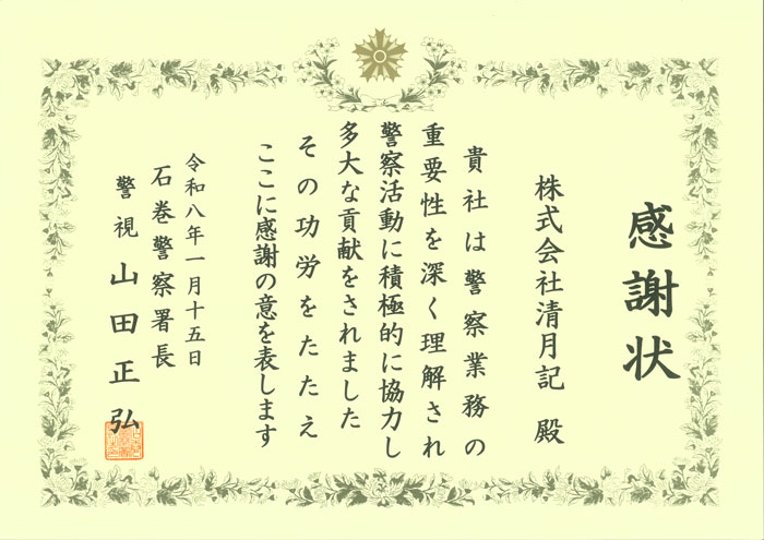 2026年1月15日、警察業務への理解と警察活動への協力が評価され、石巻警察署より感謝状を拝受いたしました。