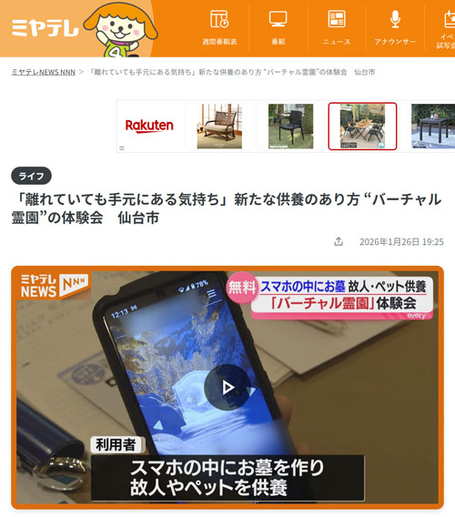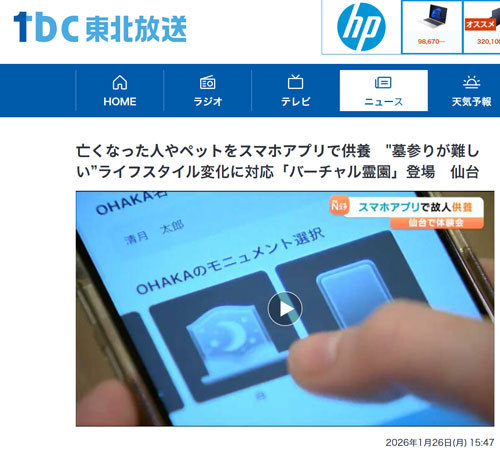 亡くなった人やペットをスマホアプリで供養 "墓参りが難しい”ライフスタイル変化に対応「バーチャル霊園」登場 仙台(2026/01/26)