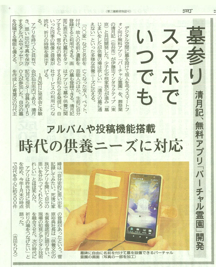 2026年2月11日(水)発行の河北新報朝刊に、清月記が伊藤忠インタラクティブ株式会社様と共同開発した、スマートフォン向け無料アプリ「バーチャル霊園」の記事が掲載されました。