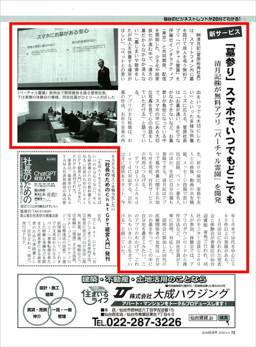 このたび、地域経済情報誌 「仙台経済界」2026年3-4月号に、清月記が伊藤忠インタラクティブ株式会社様と共同開発したスマートフォン向け無料アプリ「バーチャル霊園」の記事が掲載されました。