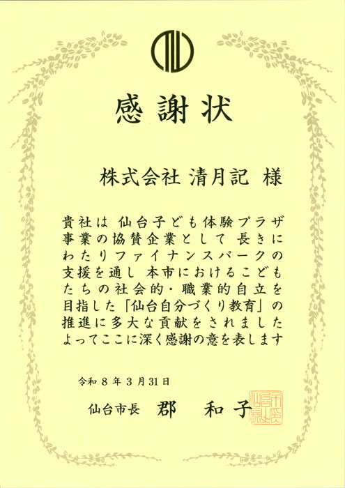 このたび清月記は、「仙台子ども体験プラザ事業」における協賛企業としての長年の取り組みに対し、感謝状をいただきました。