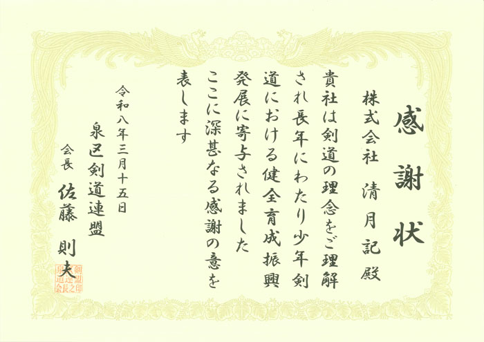 2026年3月15日、「第40回 泉海洋センター杯小学生剣道大会」において、長年にわたる少年剣道の健全育成への支援に対し、感謝状をいただきました。